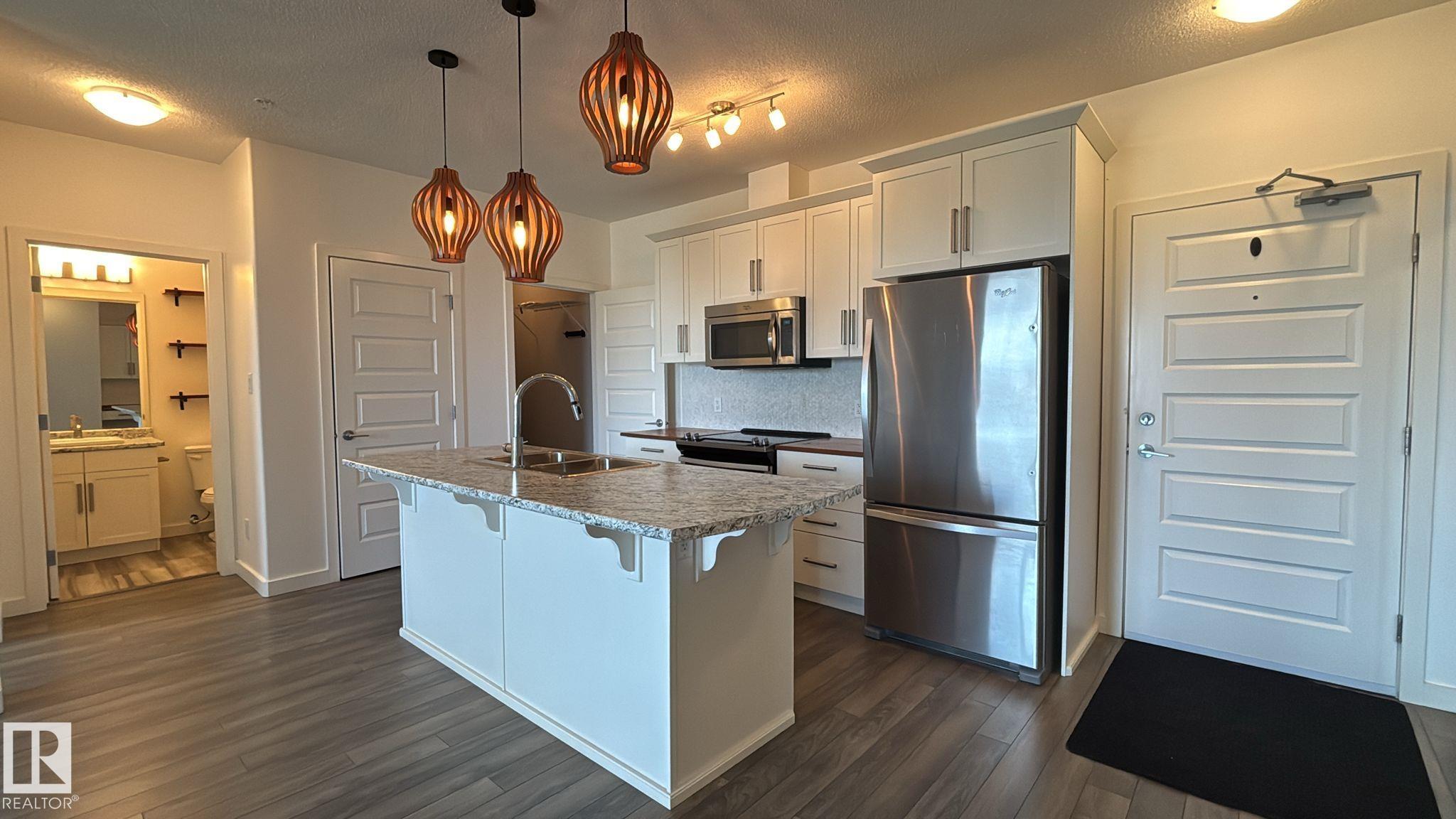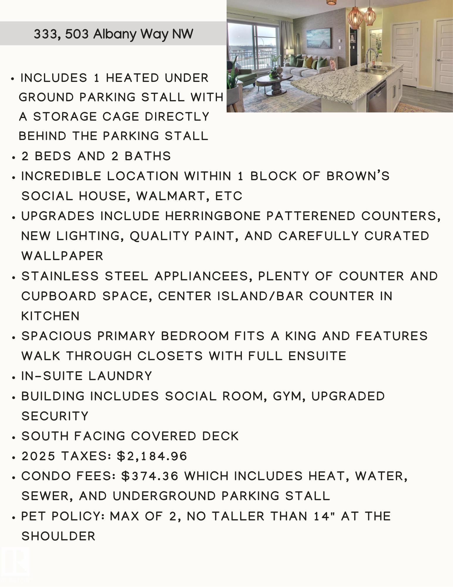 Freshly painted 2 bed/2 full baths. 1 underground stall AND a storage cage. Dogs/cats allowed. Stylish condo located in sought after Albany! Upgrades incl herringbone patterned counters, new lighting, quality paint, and carefully curated wallpaper. Entrance has flexible separate desk/office area. SS appliances, plenty of counter & cupboard space, center island/bar counter. Spacious primary fits King suite & features walk through closets w/full ensuite. Other side of the home (separated for privacy) 2nd bedroom & full bath. In-suite laundry w/stacked full sized front load. Building has social room, gym & upgraded security including cameras. 2025 Taxes $2,184.96. Condo fees: $370.82 include heat, water, sewer & underground parking. Dogs & cats allowed! Pet Policy: Max 2, no taller than 14" at shoulder. Pet application available. South facing covered deck, natural gas BBQ included. Some images have been virtually staged to better showcase the true potential of rooms and spacesÿinÿtheÿhome.