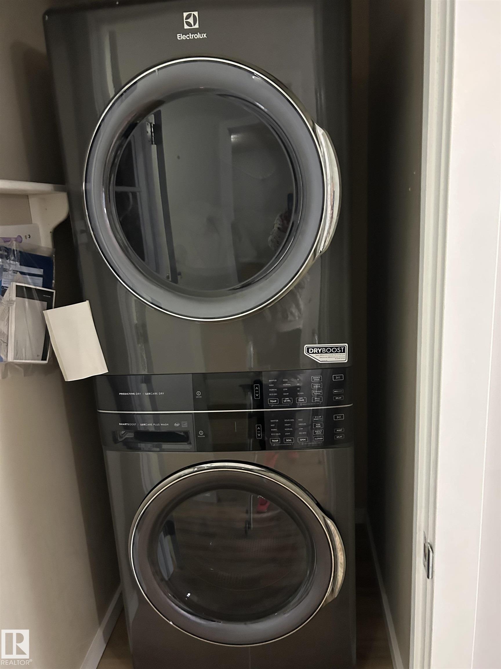 Step into this breathtaking top-floor, 2-bedroom, 2-bathroom condo, where every detail offers comfort and elegance. Enjoy sweeping panoramic views of the river and lush greenery from your sun-drenched, open-concept living space. The modern kitchen flows seamlessly into the expansive living area, perfect for both relaxation and entertaining. Recent upgrades include elegant new vinyl flooring throughout, a gleaming stainless steel fridge, and two brand-new modern toilets installed. Plus, enjoy the convenience of ensuite laundry right in the unit. Step outside onto the generous balcony, ideal for savoring sunsets or morning coffee. Both titled parking spaces--secure underground and surface--offer ultimate convenience, and you're just minutes from Yellowhead and Anthony Henday, making commuting a breeze.