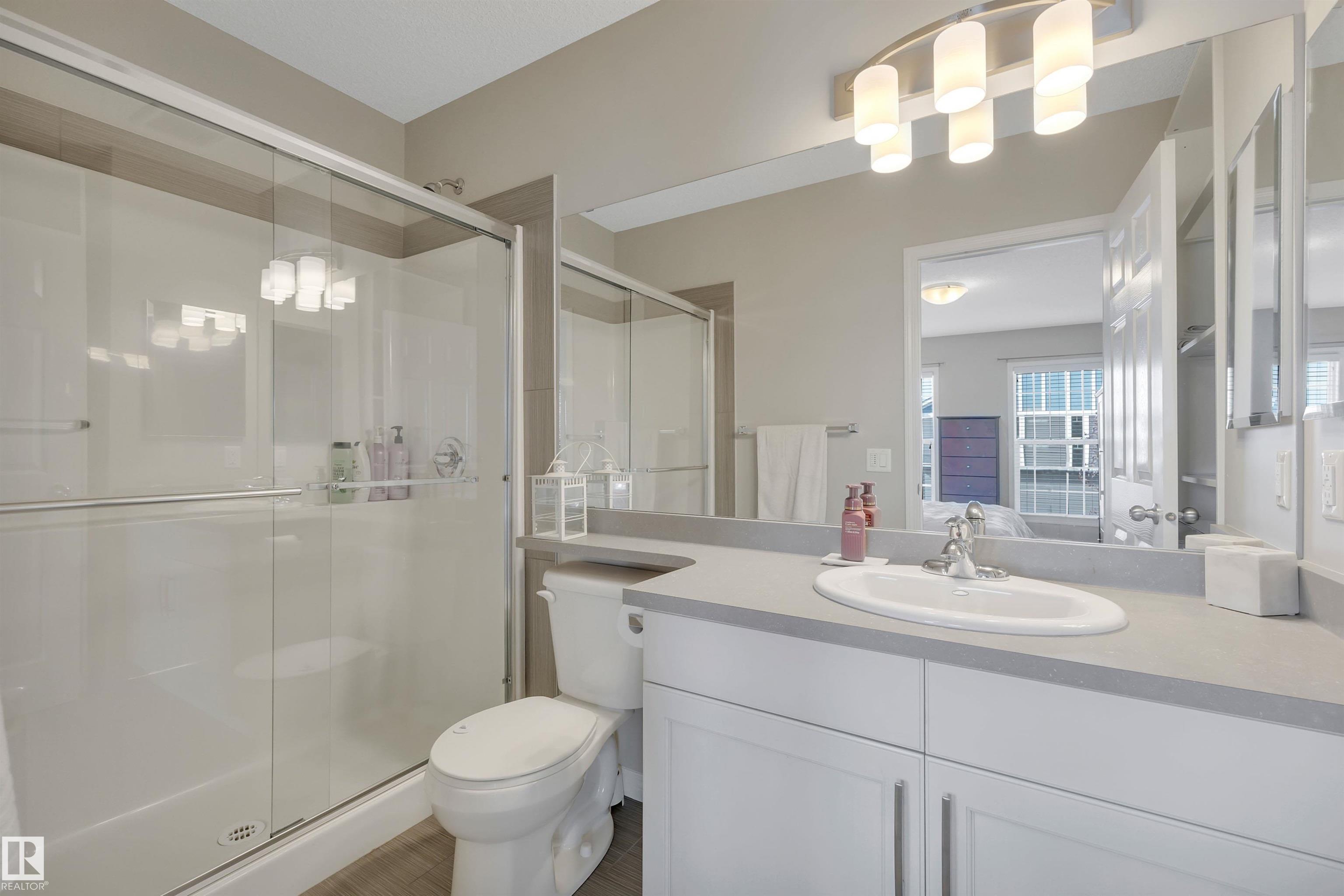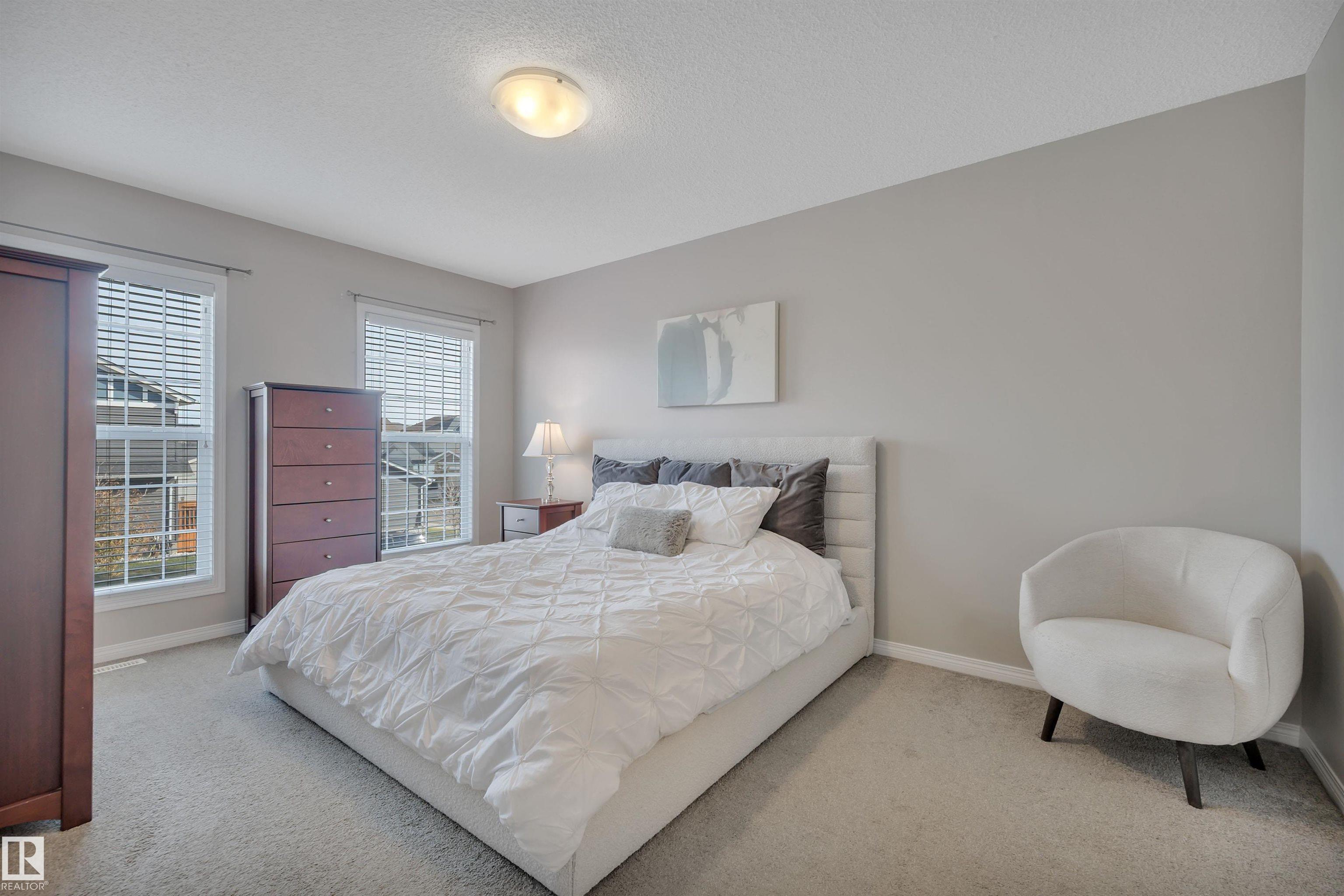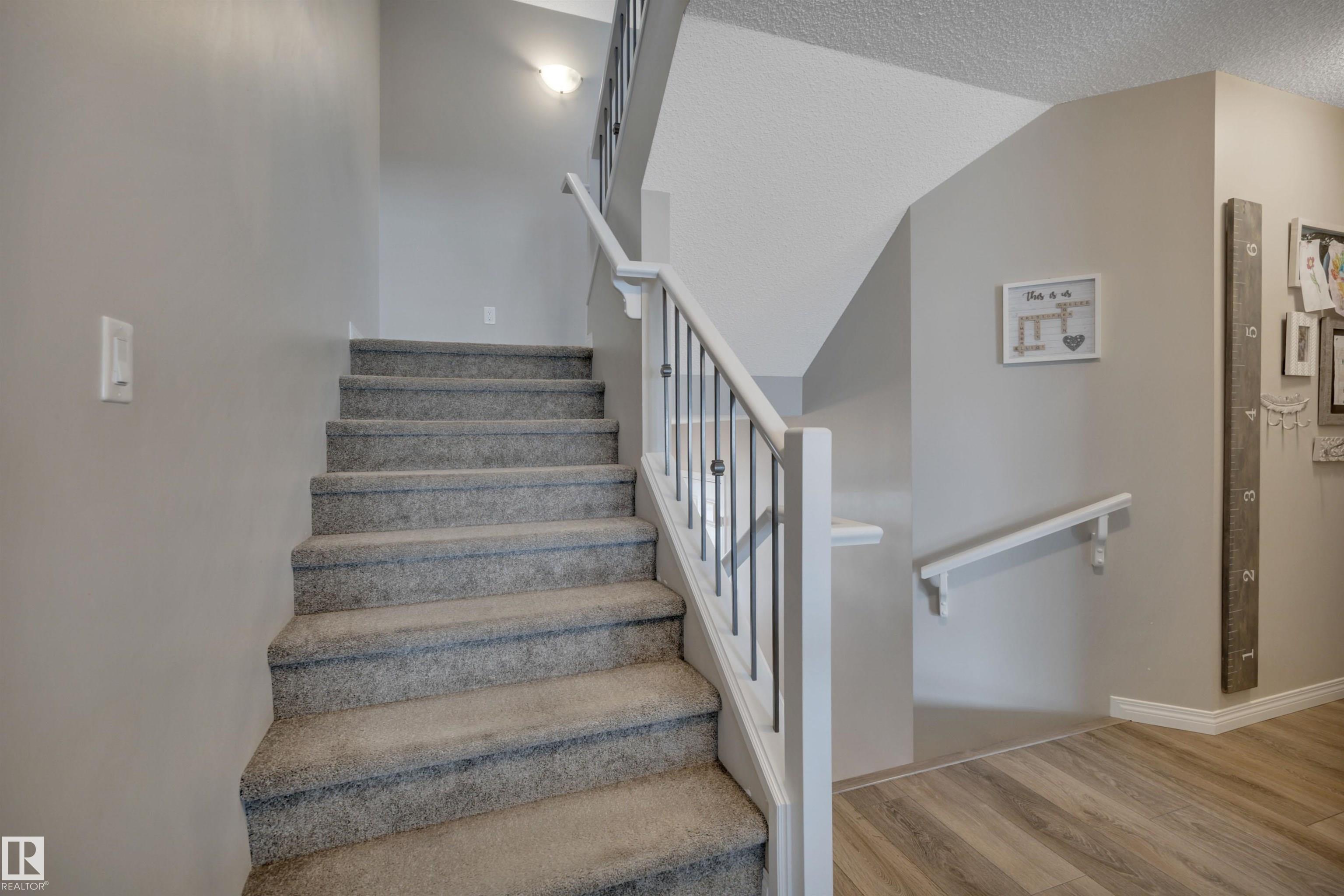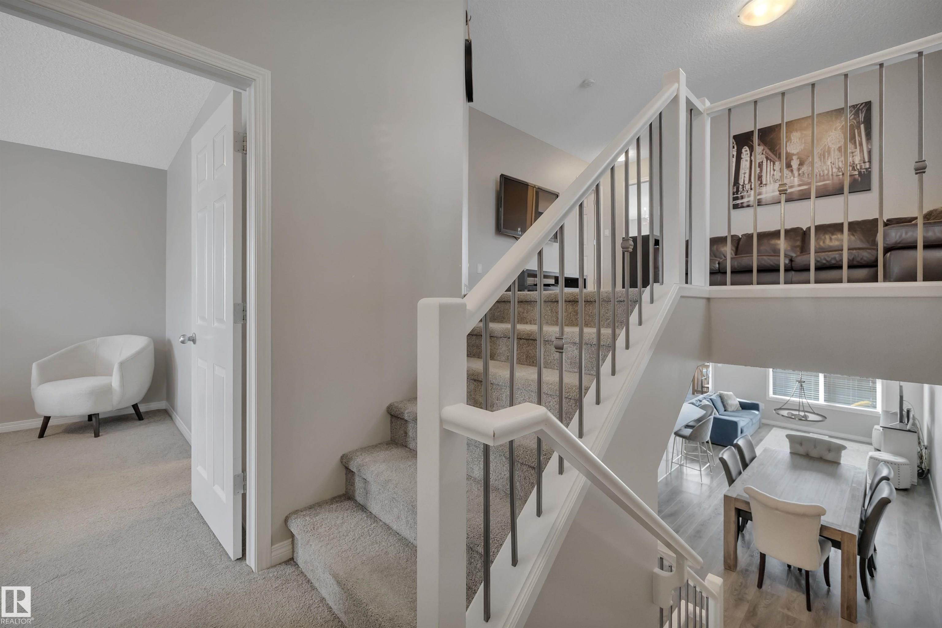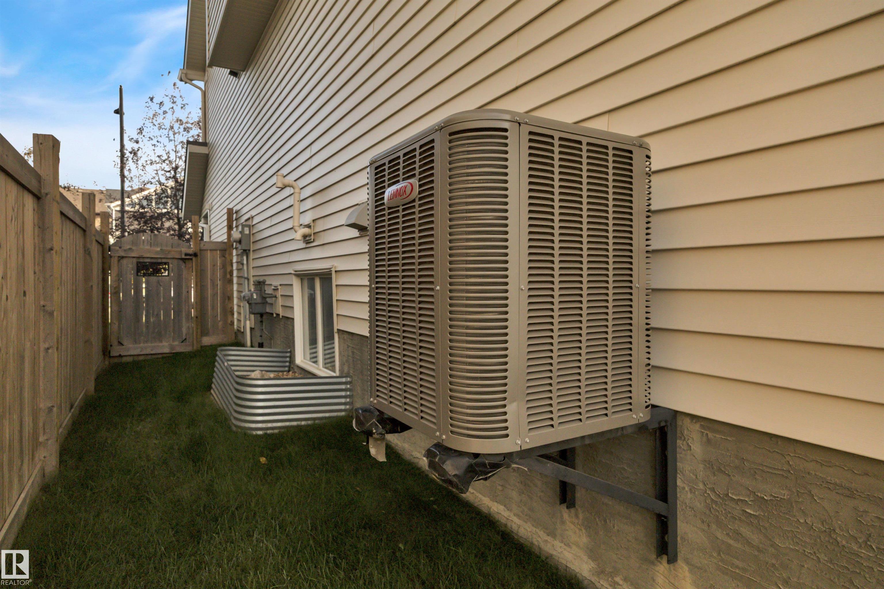 Welcome to this 3-bedroom, 2.5 bath half duplex offering over 1700 sq ft of beautifully designed living space in one of Edmonton's most sought after communities. The open-concept main floor is ideal for entertaining, featuring a spacious kitchen with stainless steel appliances, quartz countertops, and a seamless flow into the dining and living areas, plus a convenient powder room for guests. Upstairs features 3 bedrooms, including a primary with ensuite, a bonus room , another 4-piece bathroom and upper-floor laundry. Stay comfortable year round with central A/C! The huge backyard backs onto a walking path for added privacy and out-door enjoyment. The basement is unfinished and awaits your special touch. Located in the heart of Chappelle gardens you can take advantage of the amenities including outdoor skating rink, walking trails, community gardens, basketball courts, and splash park. This meticulously maintained home is move in ready and includes a single attached garage