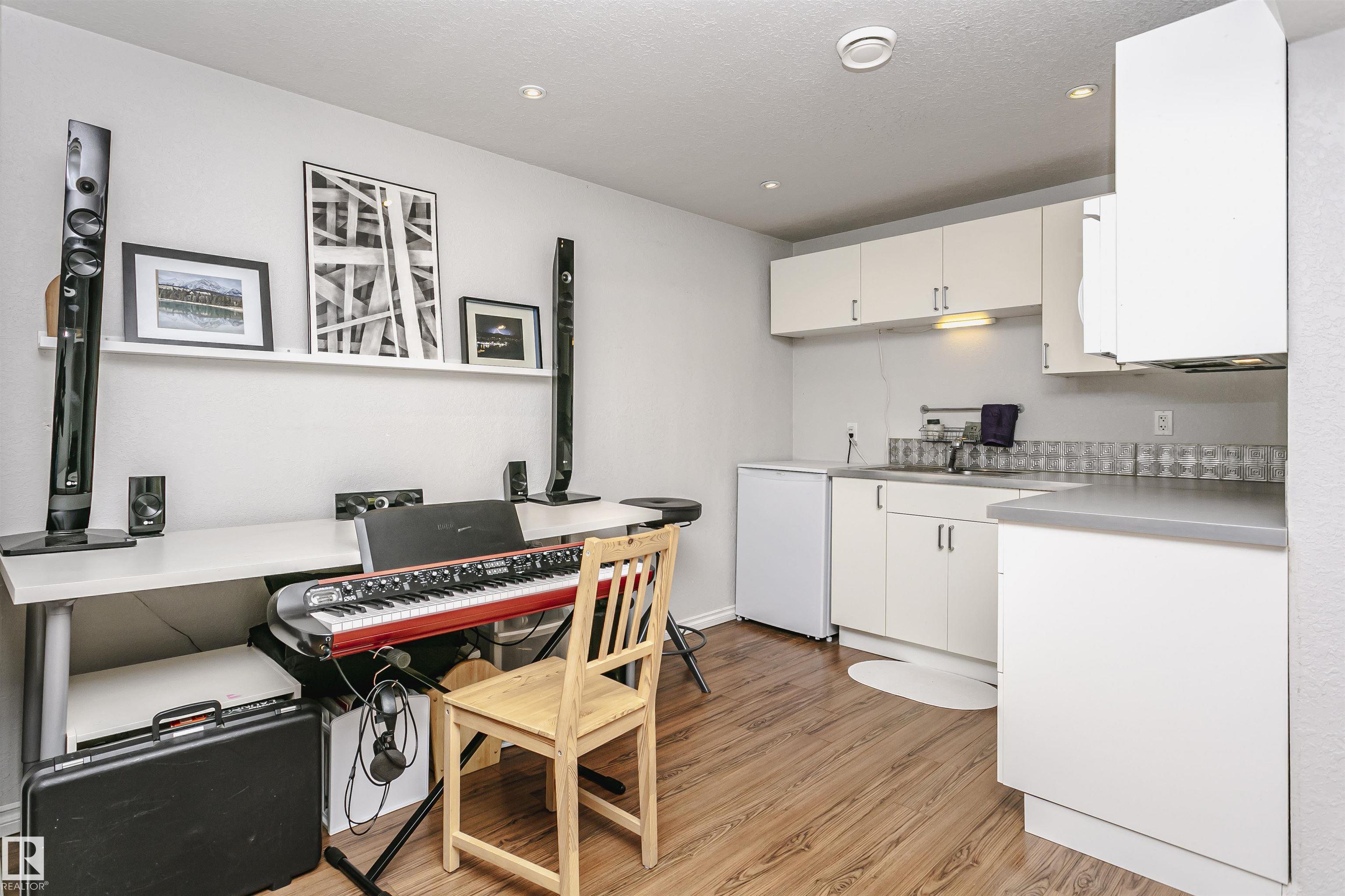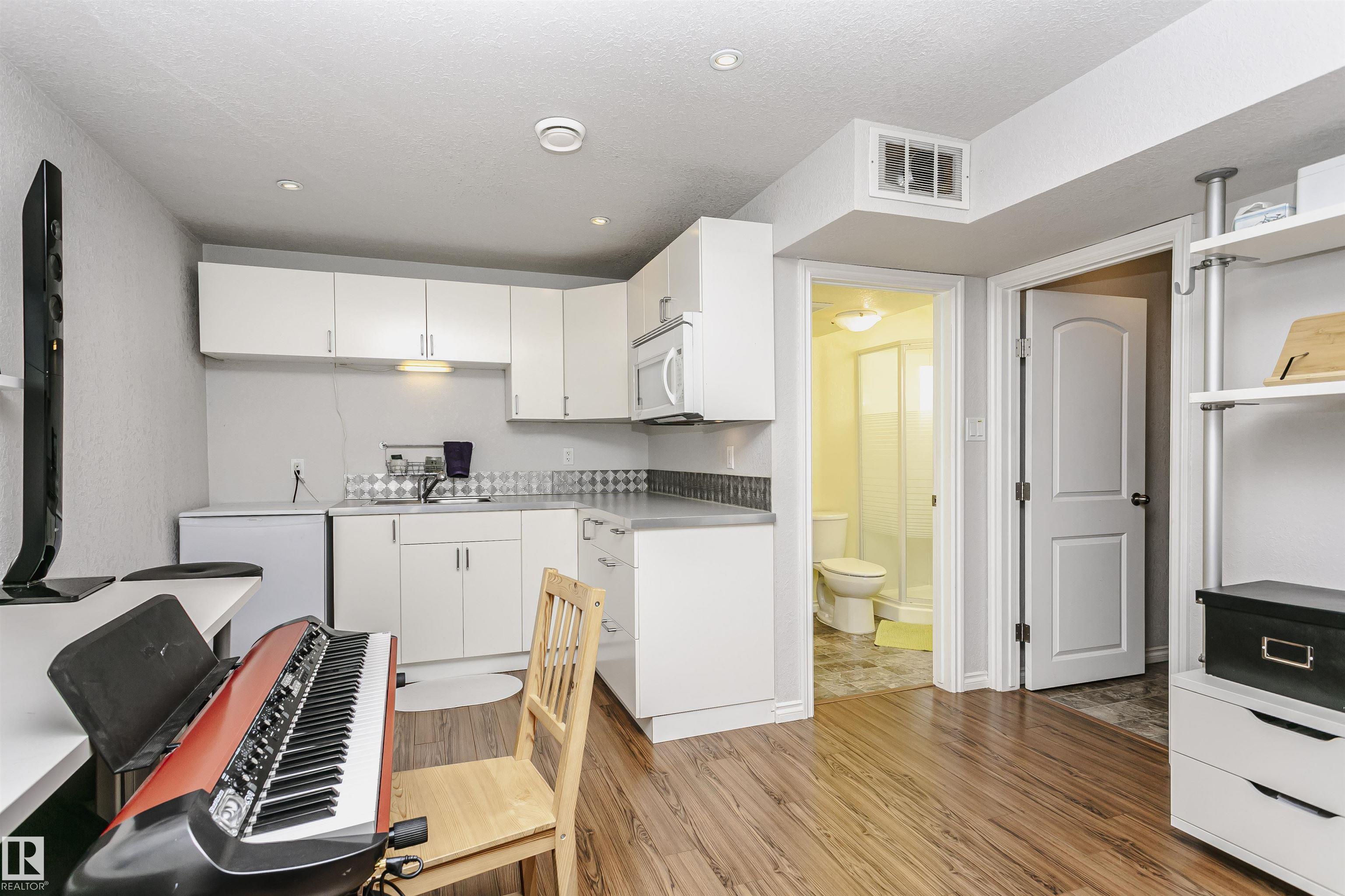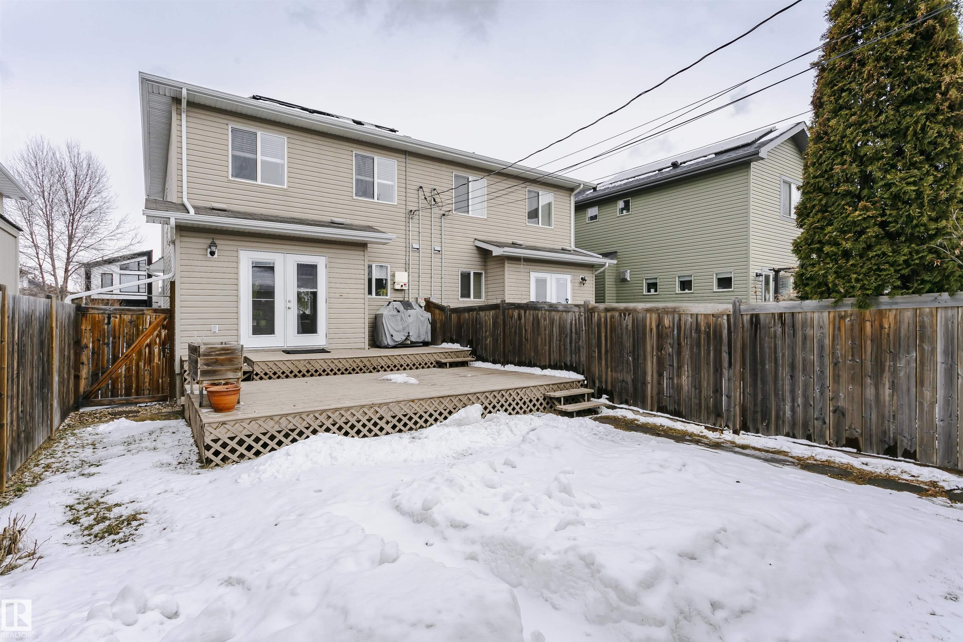 Amazing 4 bedroom/3.5 bathroom non-condo half-duplex in the very desirable neighbourhood of Ritchie. Equipped with solar and A/C, this modern home is only blocks away from Mill Creek Ravine! The main floor has hardwood throughout, a bright, open living room/formal dining room space with tile-surround gas fireplace, and a kitchen with stainless steel appliances open to a den that can also be used as an eat-in kitchen area. Upstairs you will find a spacious primary suite with a 3-piece ensuite bath and walk-in closet, as well as two additional bedrooms and another 4-piece bathroom. The finished basement, which could be converted into a legal suite, has a separate entrance and includes the 4th bedroom, 3-piece bath, a kitchen with sink, built-in microwave and small fridge and a sizeable rec room. Additional features include a large deck and double detached garage! Minutes from shopping, public transport, trendy restaurants and all amenities, this home is a must see!