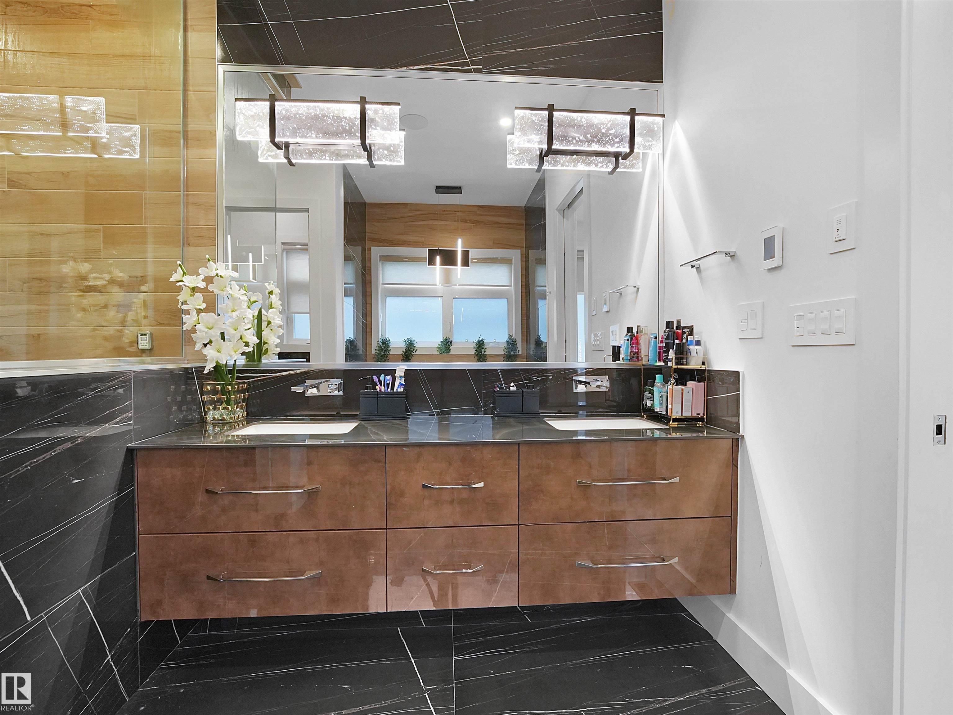 Contemporary & modern WALKOUT CUSTOM MANSION in prestigious Westpointe backing onto green space with stunning views. COMBINED 6500+ sq.ft of total living space with HEATED TRIPLE GARAGE. Formal dining and living room on main with sep. entry. Features 6 beds + 13' ceiling bonus room, 6 baths, fully finished walkout bsmt, 10' ceilings on main & 2nd, glass rails, waterfall feature wall, Control4 automation throughout, porcelain & quartz ctps, DUAL A/C, 4X2 TILES ON MAIN & BASEMENT W/INFLOOR HEATING. Ultra-modern kitchen with Dacor SS appliances, spice kitchen, 4X4 ELEVATOR, island & nook to covered deck. Dual masters with 5pc ensuites, STEAM SHOWERS & FP walls, 2 add'l beds, 4pc bath, laundry with sink, flex/prayer room. Bsmt offers 1 bed, 1 bath, theatre under garage with bar, gym, office with glass, huge rec room & HEATED STAMPED DRIVEWAY